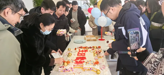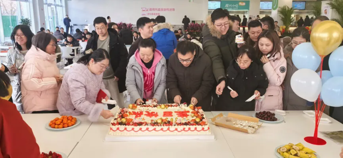 1月生日的员工们集聚一堂,共同庆祝生日。