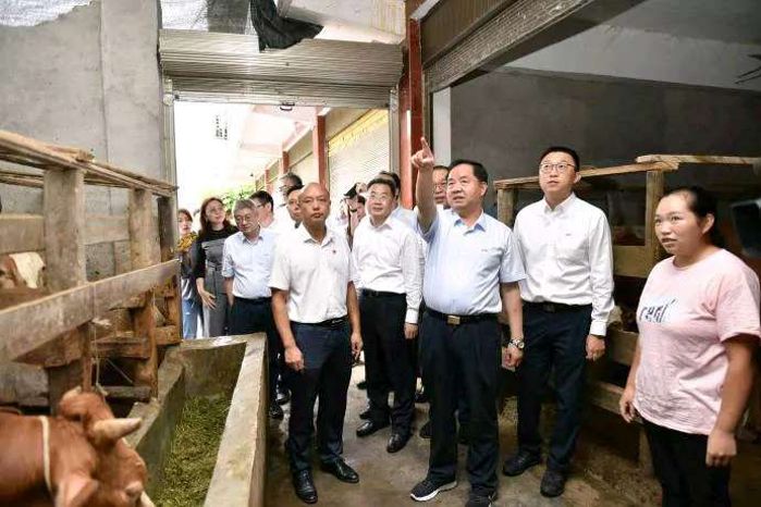 在高峰村脱贫致富带头人赵雪红家里,陈肇雄走进牛棚认真查看养殖情况,亲切询问饲养数量、年收入情况。赵雪红家曾经因为一次突发的特大山洪,失去了亲人,也几乎丧失了对生活的信心。在中国电科家庭式母牛散养项目启动后,她主动报名参与,并按照散养要求,全身心的做好科学饲养。2019年,赵雪红卖了5头半大牛犊,换来了近5万元的收入,家里还有8头牛在栏,价值近20万元。陈肇雄对赵雪红自立自强的精神表示赞赏,对其家庭的扶贫变化感到高兴,叮嘱她要发挥好致富带头人作用,带动更多乡亲脱贫致富。